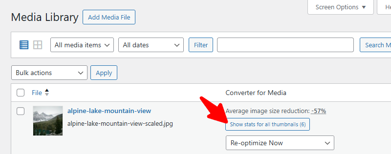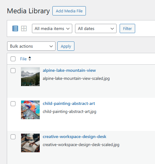 One file “alpine-lake-mountain-view.jpg” was uploaded to the Media Library, but WordPress generated an additional 6 files in other sizes, so-called thumbnails.