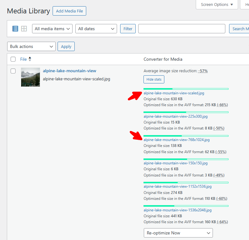 You can also go to the Media Library, find the file and click the “Show stats for all thumbnails” button in the “Converter for Media” column: