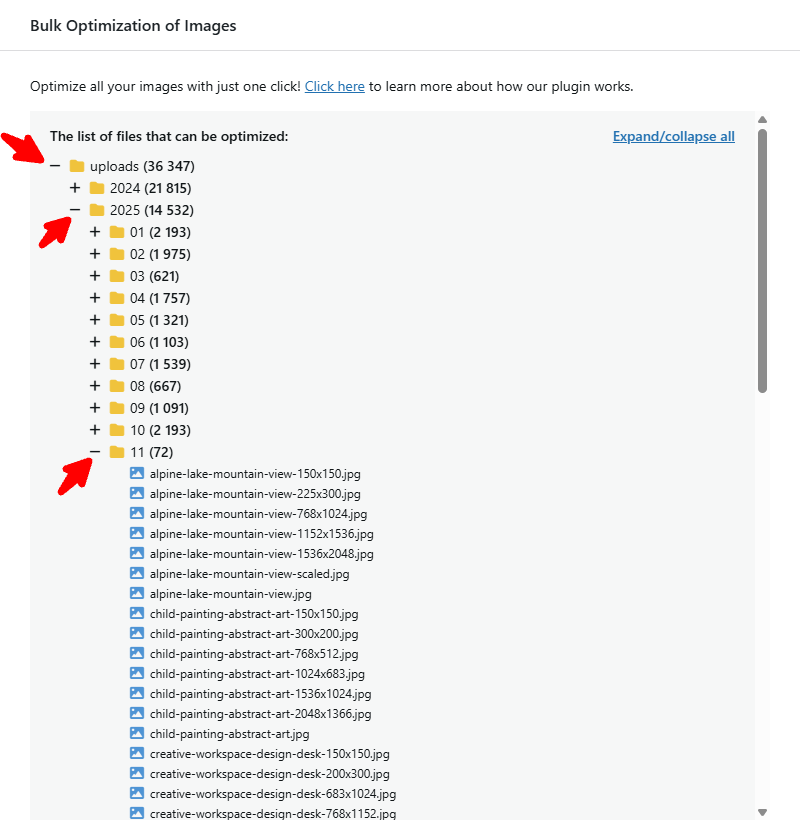 In the “Bulk Optimization of Images” section, you can expand the list of directories and check how many files are in each directory and what kind of files they are (in this example, we are looking for these 3 files shown above):