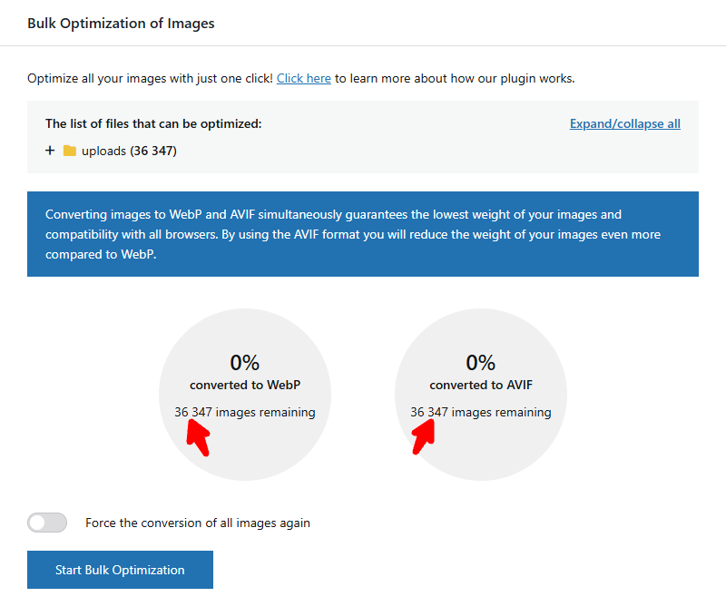 In the “Bulk Optimisation of Images” section, please check how many images you have to convert to WebP and how many images you have to convert to AVIF: